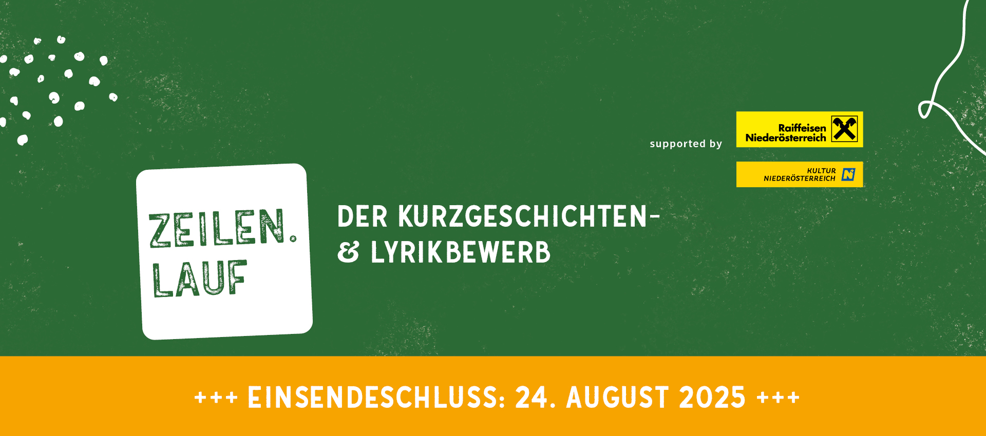 Beim Kurzgeschichtenbewerb zeilen.lauf können die AutorInnen eine selbstverfasste, noch nicht publizierte Geschichte einreichen und haben die Möglichkeit, attraktive Sach- und Geldpreise zu gewinnen. Die einzigen Vorgaben sind, dass das Werk in deutscher Sprache geschrieben ist und den Umfang von 4500 Zeichen (Leerzeichen, Tabstopps und Absätze werden nicht berücksichtigt) nicht überschreitet. Pro Person darf nur eine Geschichte eingereicht werden. Das Thema ist frei wählbar.